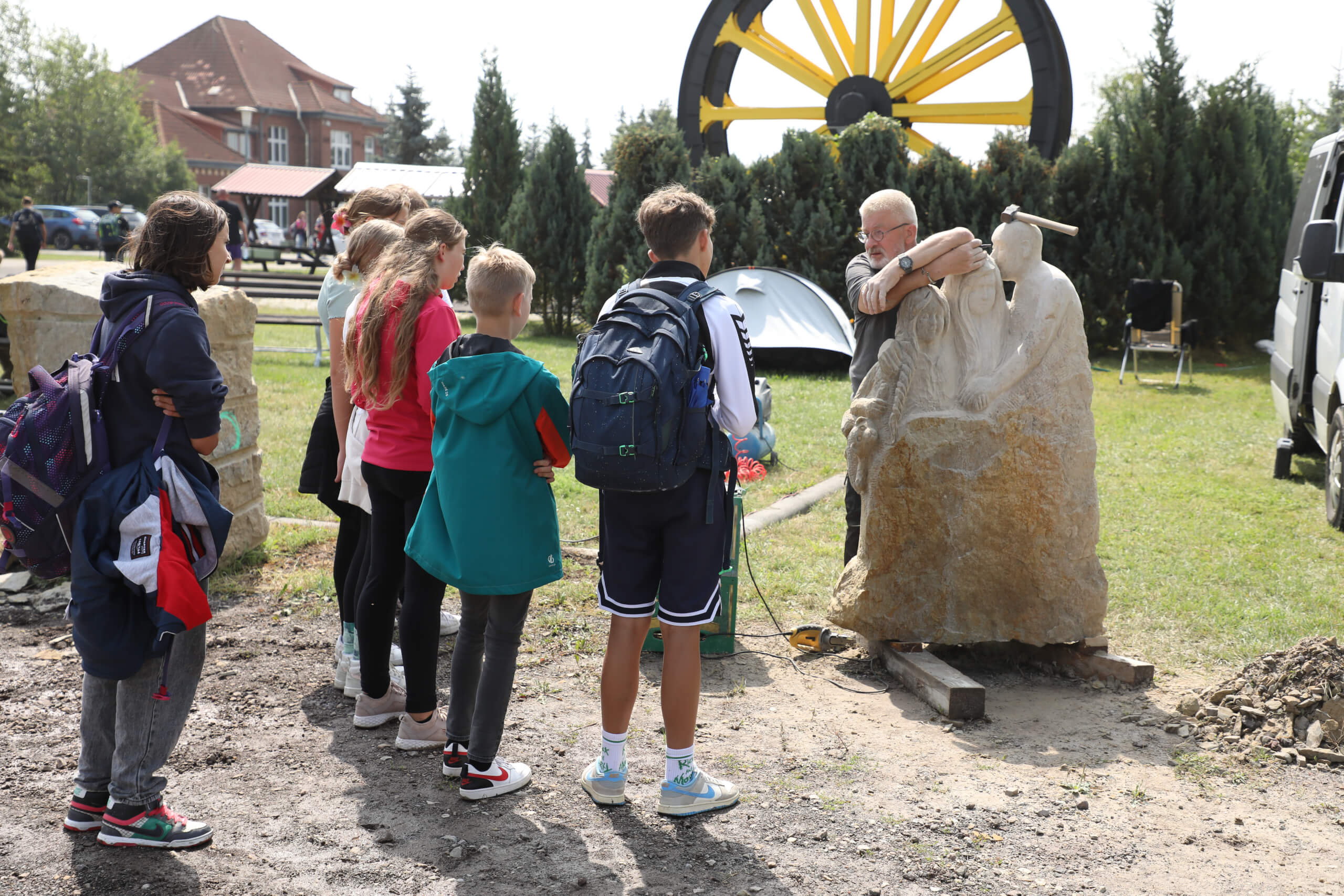 Am Vormittag besuchten Schülerinnen der Thüringer Gemeinschaftsschule Menteroda den Schauplatz in der Traditionsstätte Bergbau, um mit den Künstler*innen ins Gespräch zu kommen und den Fertigungsprozess zu beobachten.